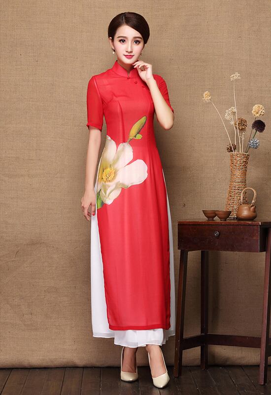 アオザイ ベトナム 民族風ドレス ロングワンピース サイドスリット エレガント 半袖 花柄 結婚式 披露宴 お呼ばれ 大きいサイズ S M L Ll 3l 4l レッド 赤い 代 30代 40代 50代 Elegant